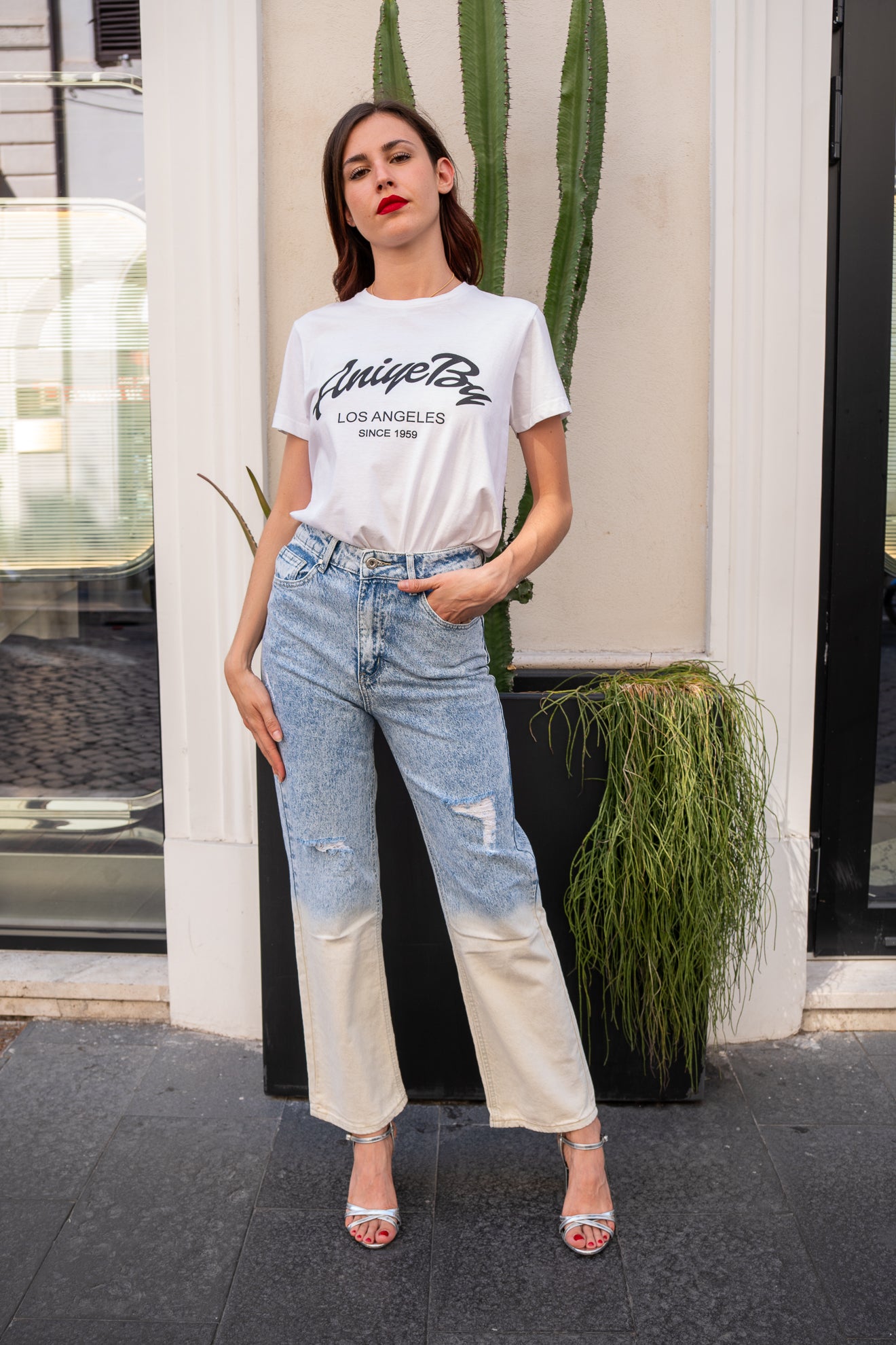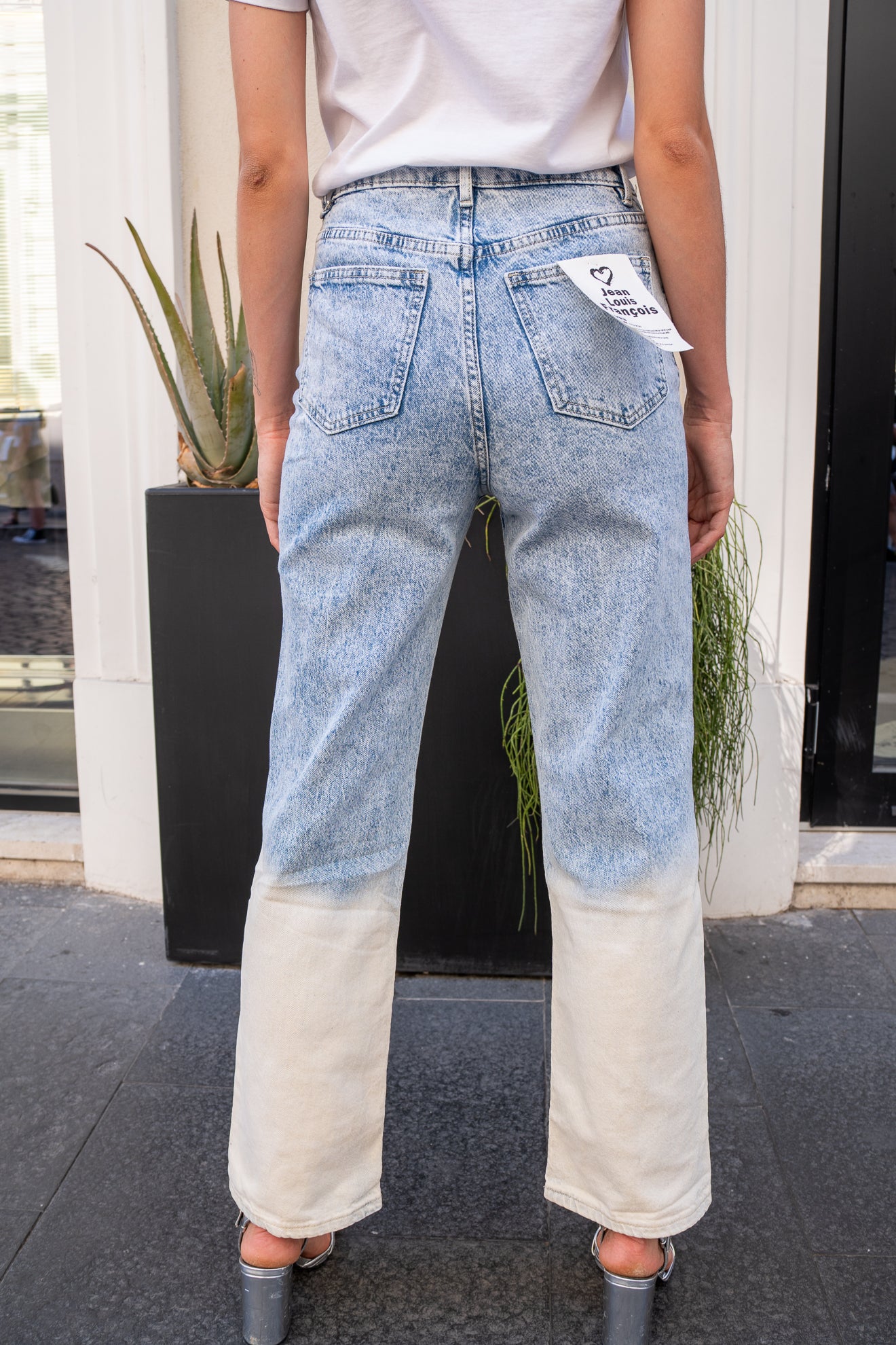 Il particolare effetto sfumato su denim bianco crea un look distintivo e versatile, ideale per chi cerca un capo sofisticato che valorizzi qualsiasi outfit con un tocco di originalità.