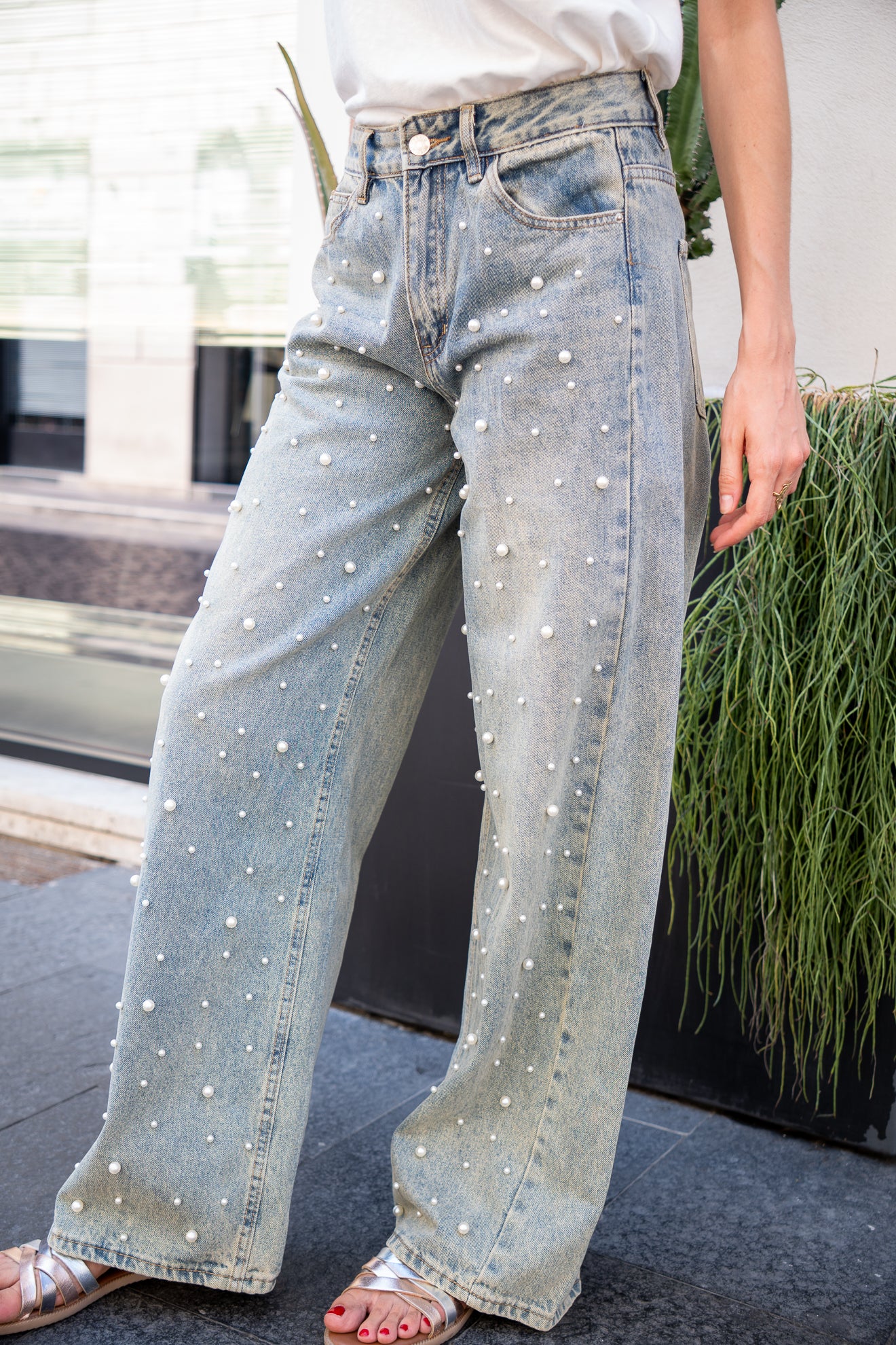 I jeans Perls GLM COUTURE uniscono un taglio a palazzo elegante a dettagli raffinati come le applicazioni di perle, che aggiungono un tocco di lusso discreto.